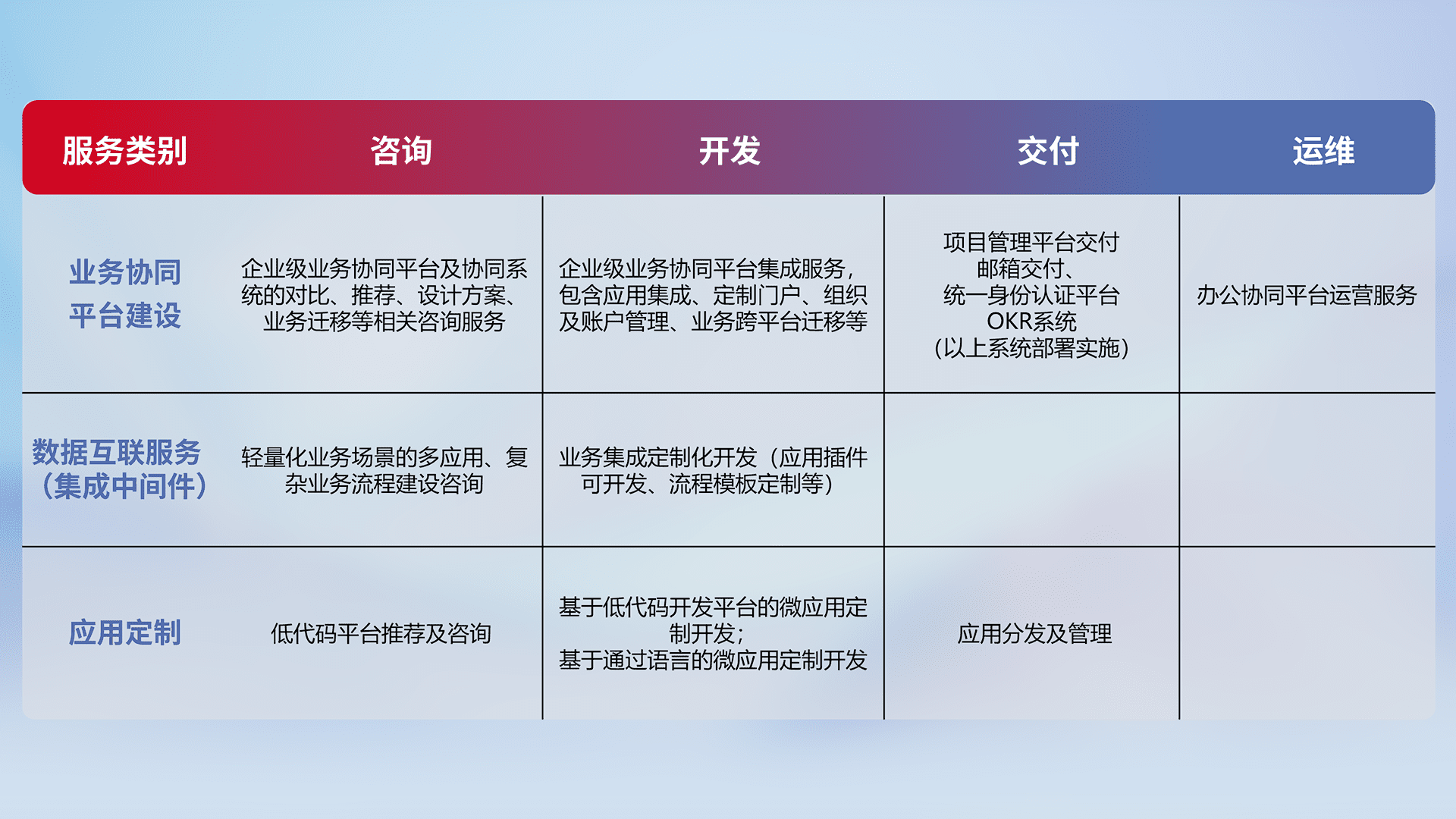 针对钉钉、、、企微、、、、IDaas等平台级产品提供产品的规划、、方案、、、、交付、、、、定制化开发等服务,,,,实现如统一协同办公、、智能客户服务、、、混合会议管理、、智能数据查询、、等业务场景,,,,实现数字化转型。。。